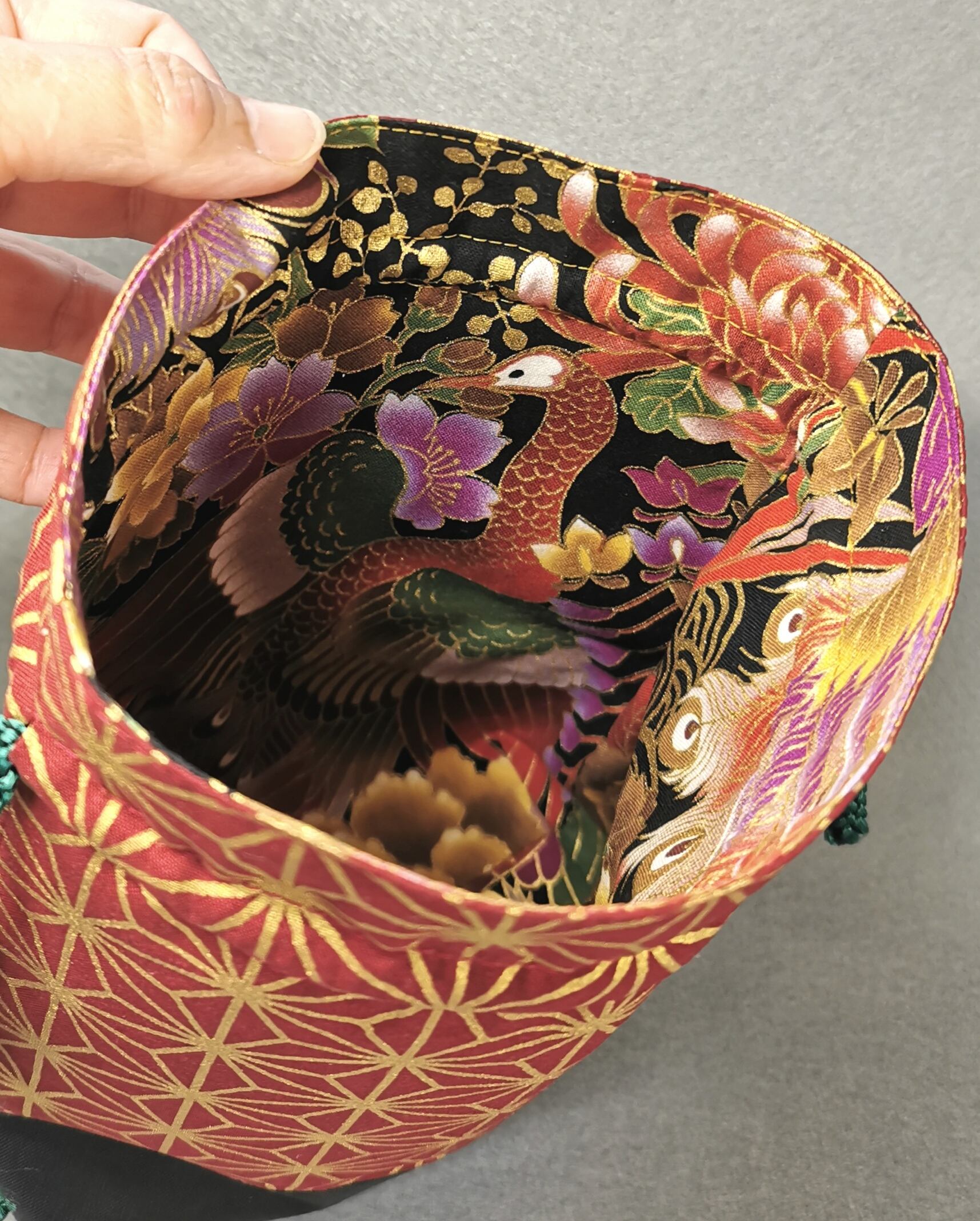 表地はエンジの麻の葉模様と黒の撥水生地をツートンに仕立て、裏地は赤の金彩を総裏地にしました。