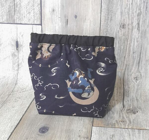 表地は風神雷神(紺)、口金部分と裏地は撥水加工の生地(黒)を使用、また厚めの接着芯で本体をしっかり独立させています。