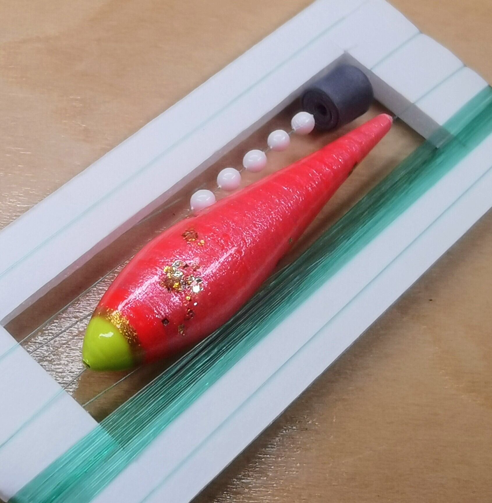 従来の『 電光石火 』のビッグバージョン(25mm〜40mm)に新色の蛍光メタリックを施した限定モデルです。 MOTHER LAKE の高い足場での釣りにも対応可能なスペックと、今までチョっと敬遠していた複雑な流水域での浮き釣りや長竿での深場などで安定した浮きの自立を促し、針を飲み込まれやすいと言うデメリットを背負ったミャク釣りの領域では、あえて浮きでアタリを取る釣りを確率させたタナゴに優しい仕掛けです。浮きは常にラインとベターな同調を保つために中通しタイプを選択。オモリの適度な調整でファットなボディーが、深棚まで直撃出来る様にゼロバランスに仕上げてあります。