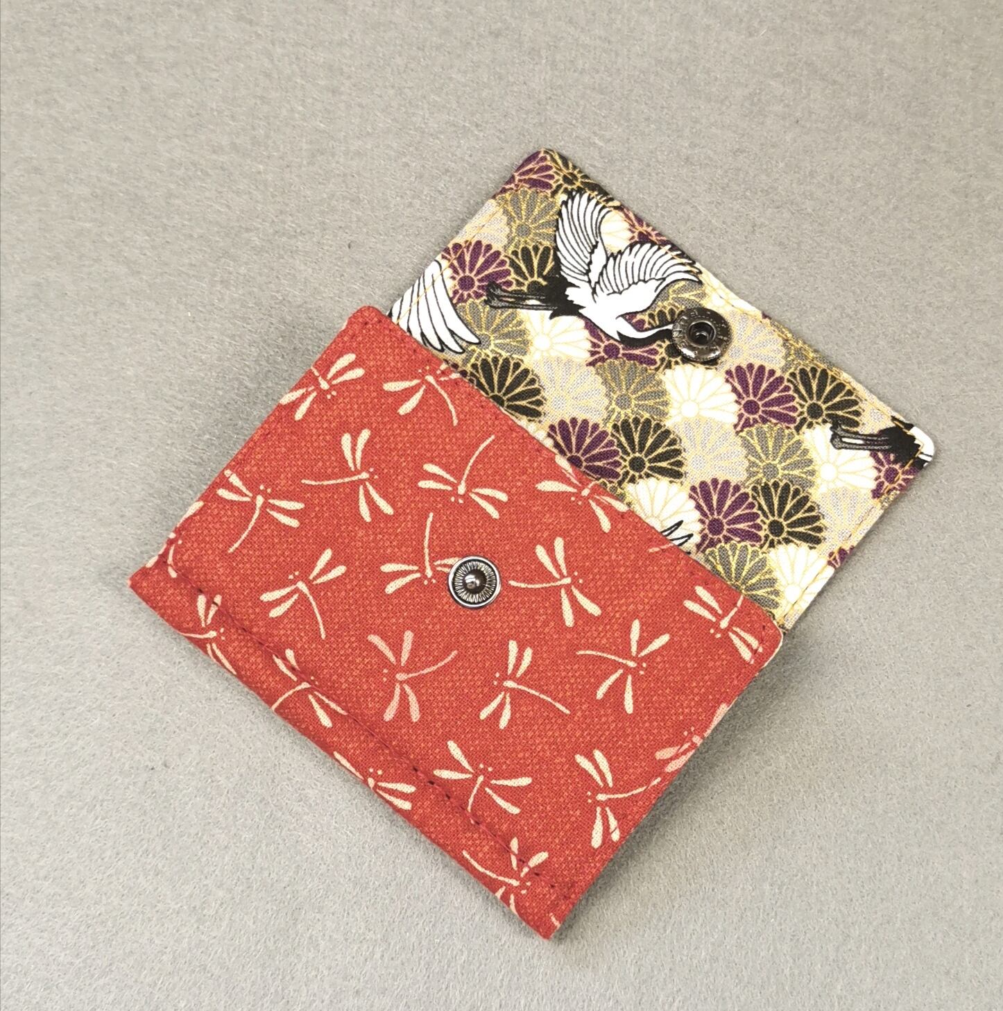 表地は赤の勝ち虫模様、裏地は鶴と扇柄、両面に適度な厚さの接着芯を貼ってあるのでしっかりとした仕上がりになっています。