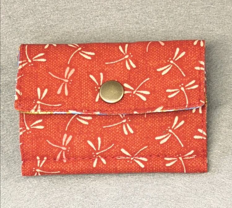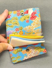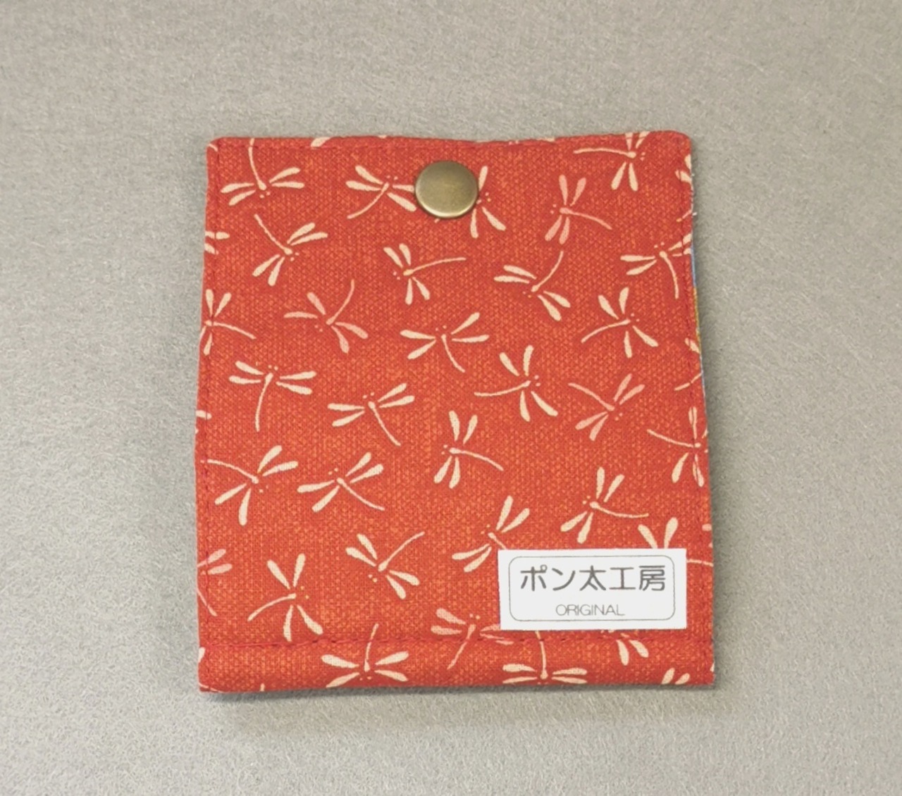 表地は赤の勝ち虫模様、裏地は空色の鶴と富士柄、両面に適度な厚さの接着芯を貼ってあるのでしっかりとした仕上がりになっています。