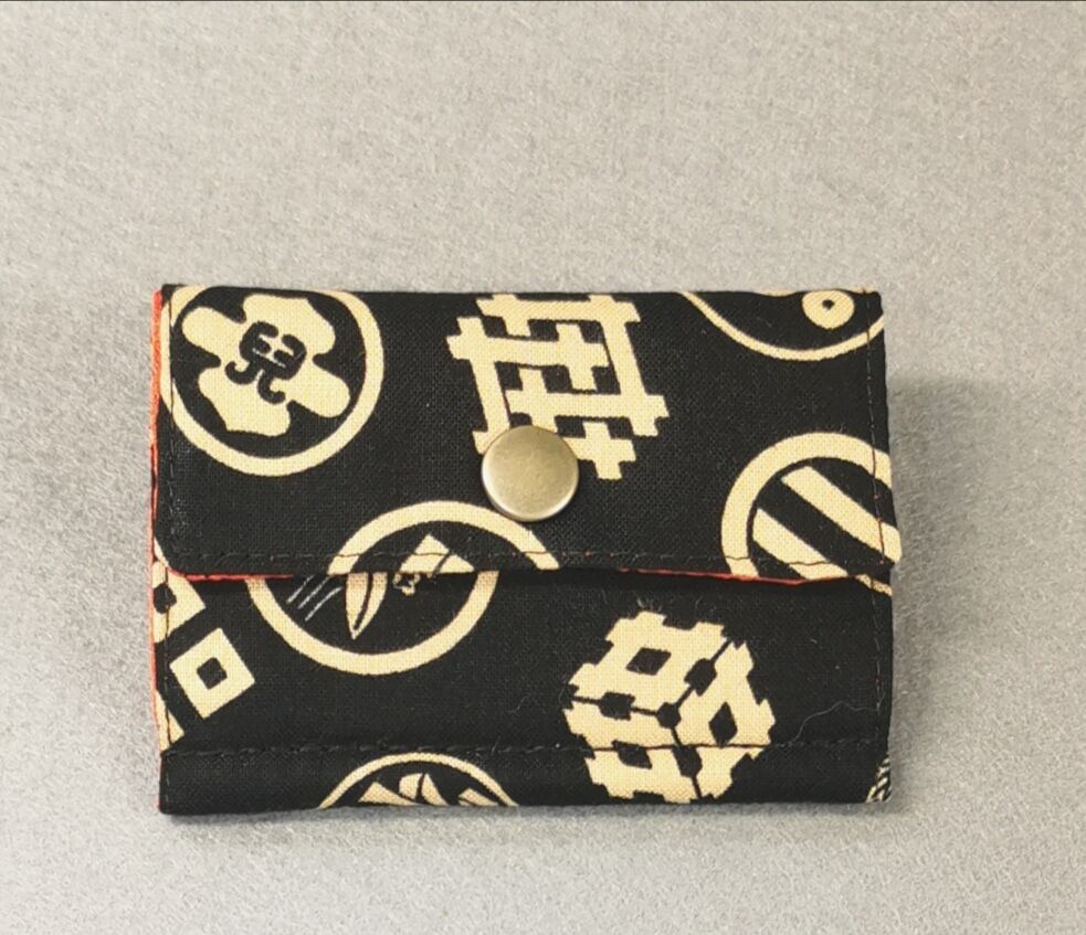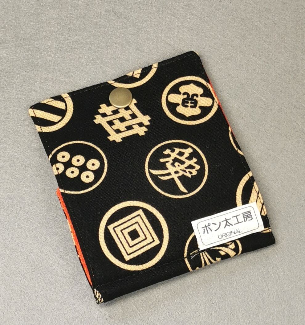 表地は黒の戦国家紋柄、裏地は朱色の綸子麻の葉模様、両面に適度な厚さの接着芯を貼ってあるのでしっかりとした仕上がりになっています。