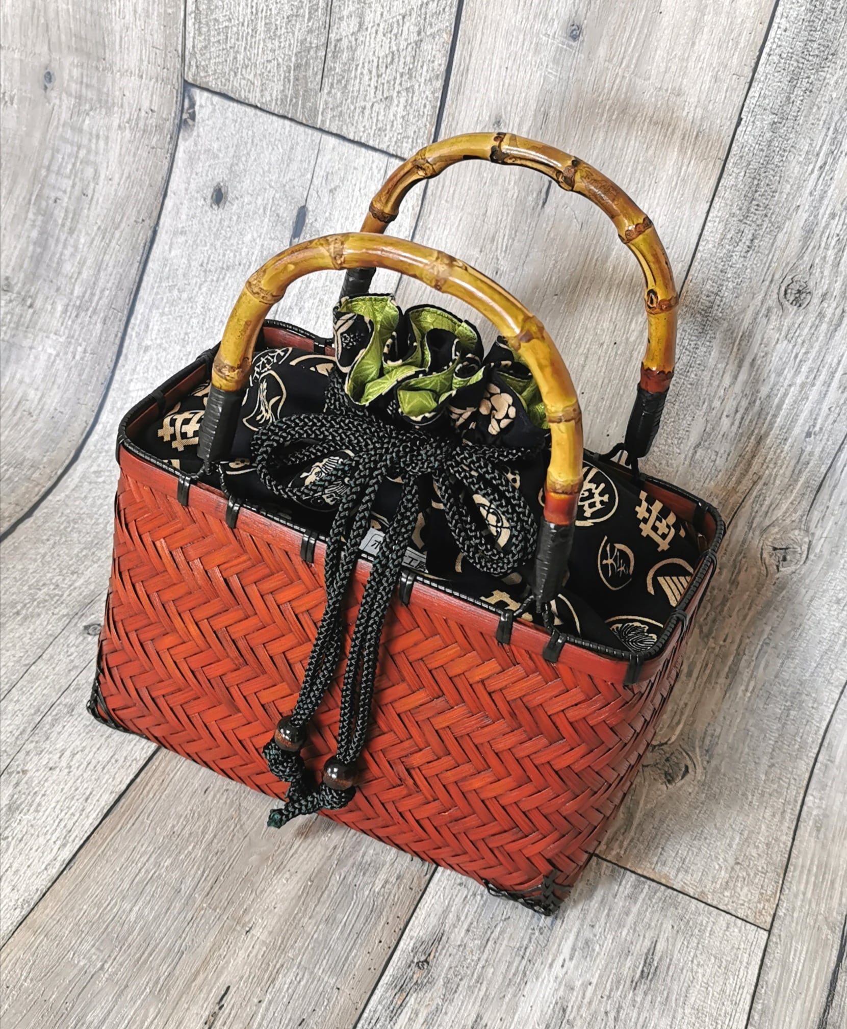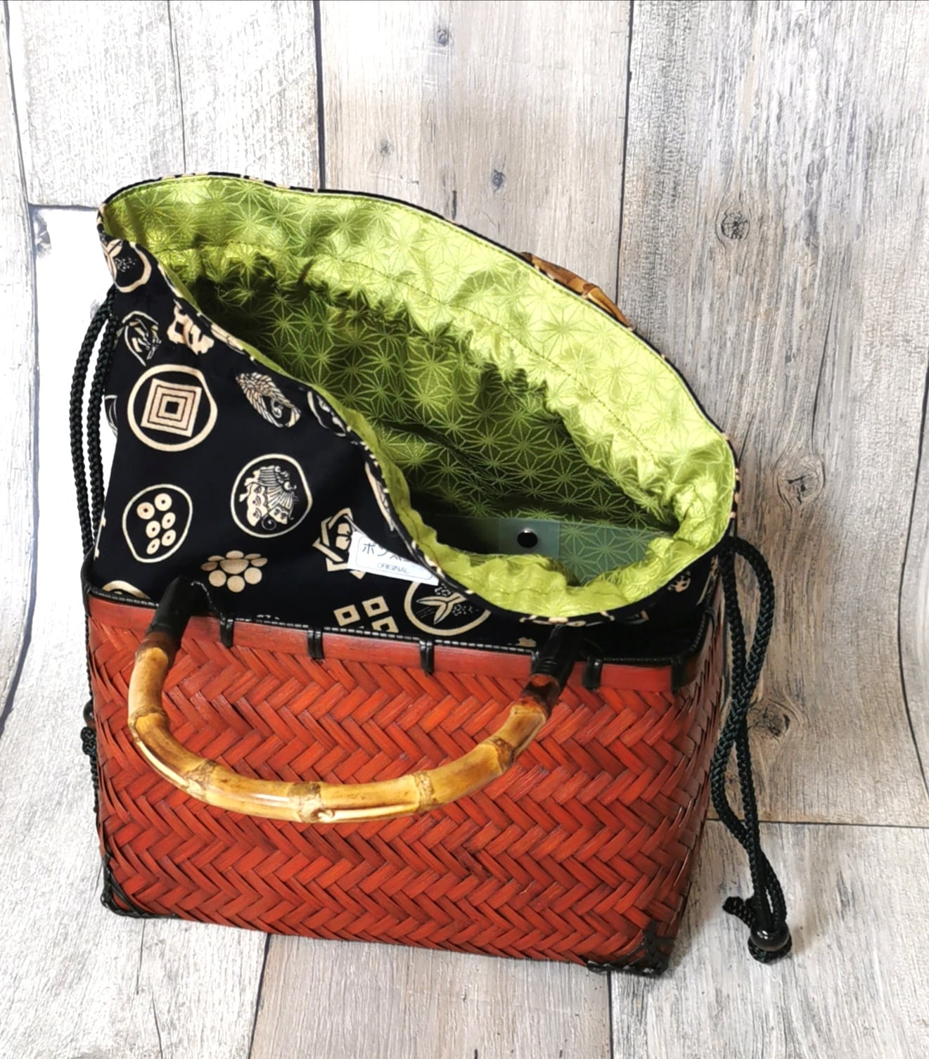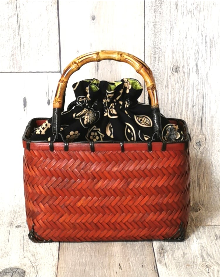 ポン太工房オリジナルの巾着と一体化させた『スペシャルバージョン』の竹かご巾着です‼️