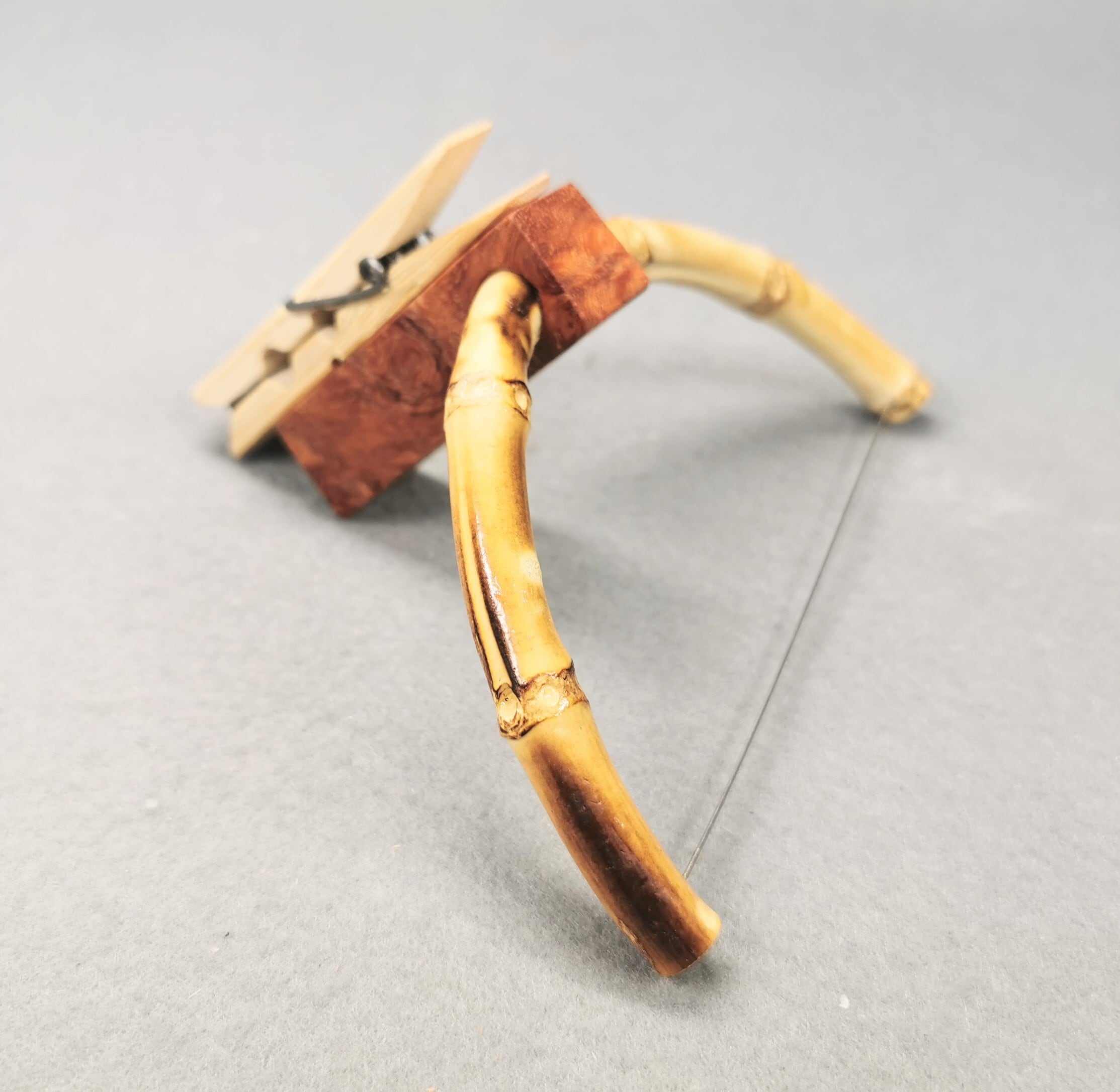 木地師と塗師が伝統技法を駆使し、自然な木目を活かし天然漆を塗り上げた非常に美しい飛騨紅春慶塗りの重箱を利用した落とし桶です。付属する弓形針外しは、添木に稀少性の高い花梨瘤を使用してあります。