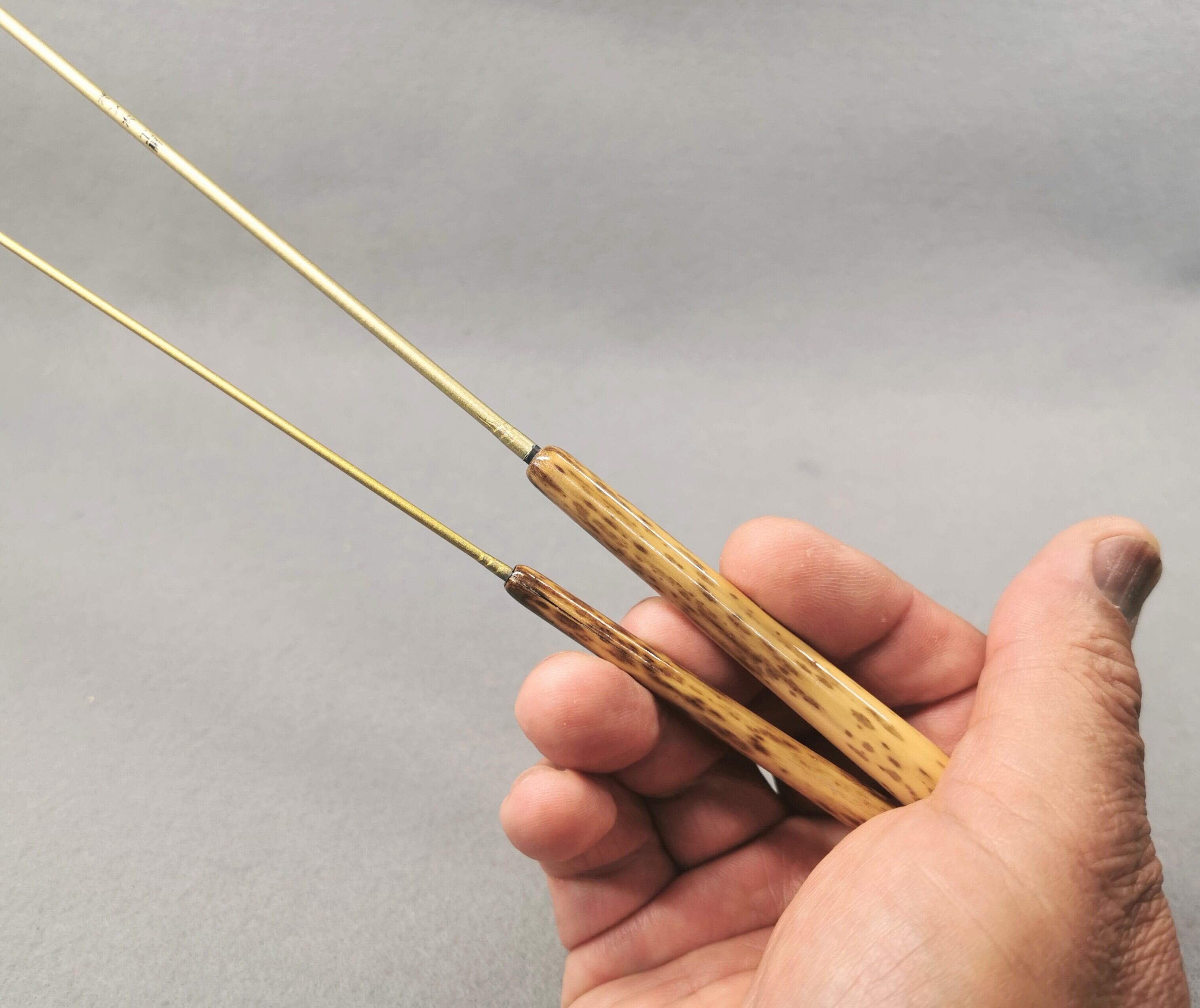 仕様は振り出しの3本継ぎに、希少ならっきょう紋竹のグリップを2個使用。グリップの付替えで55.0cmと79.5cmの2wayで楽しめます。(振り出しの先端2本を抜き装着)