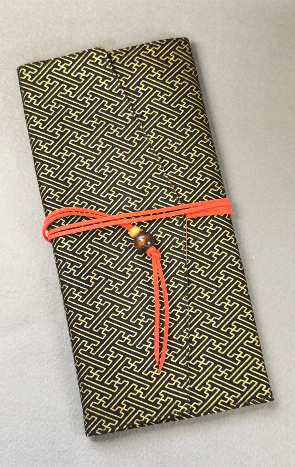 表地に紗綾形(黒/ゴールド)、裏地は鶴富士柄(赤)を組合せました。