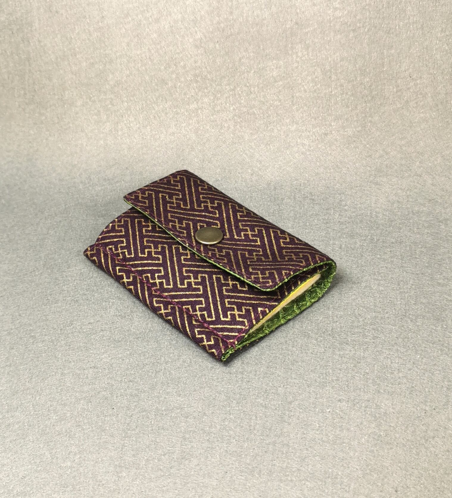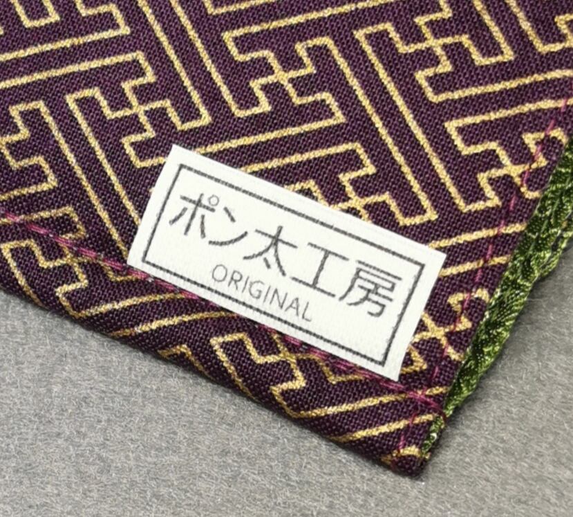 表地は紫色の紗綾形模様、裏地は綸子の深緑、両面に適度な厚さの接着芯を貼ってあるのでしっかりとした仕上がりになっています。