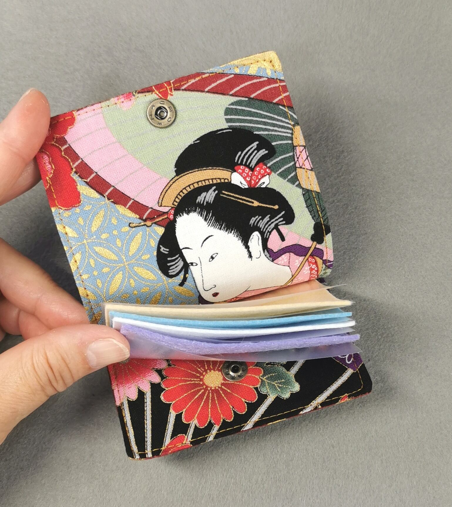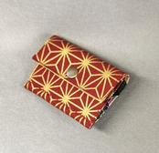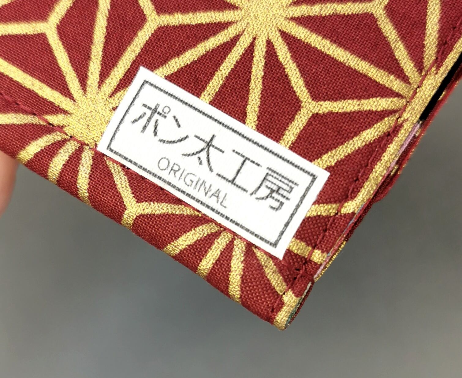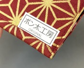 表地は赤にゴールドの麻の葉模様、裏地は艶やかな浮世絵柄、両面に適度な厚さの接着芯を貼ってあるのでしっかりとした仕上がりになっています。