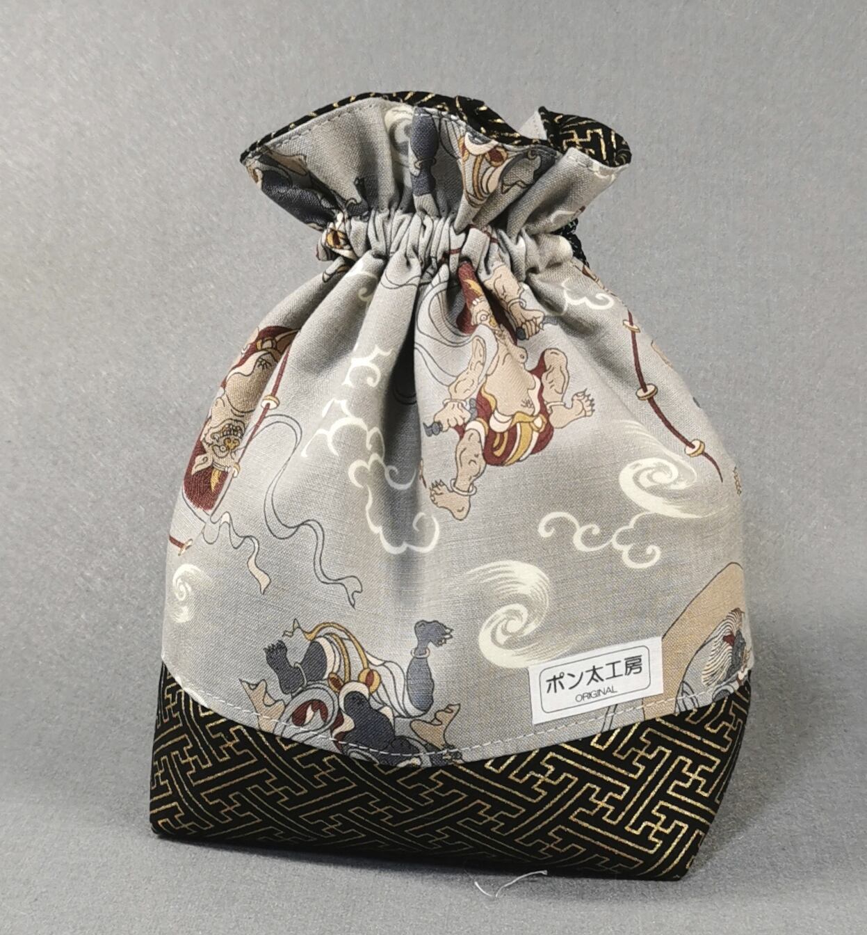 ポン太工房オリジナル巾着袋(中)風神雷神(グレー)
